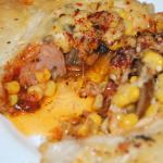 Kiełbasę pokrojoną w plastry i salami wykładamy na pieczarkach.