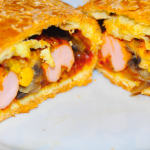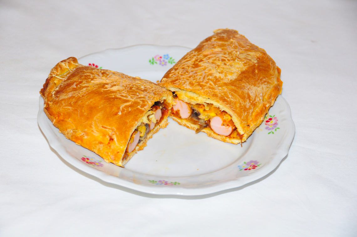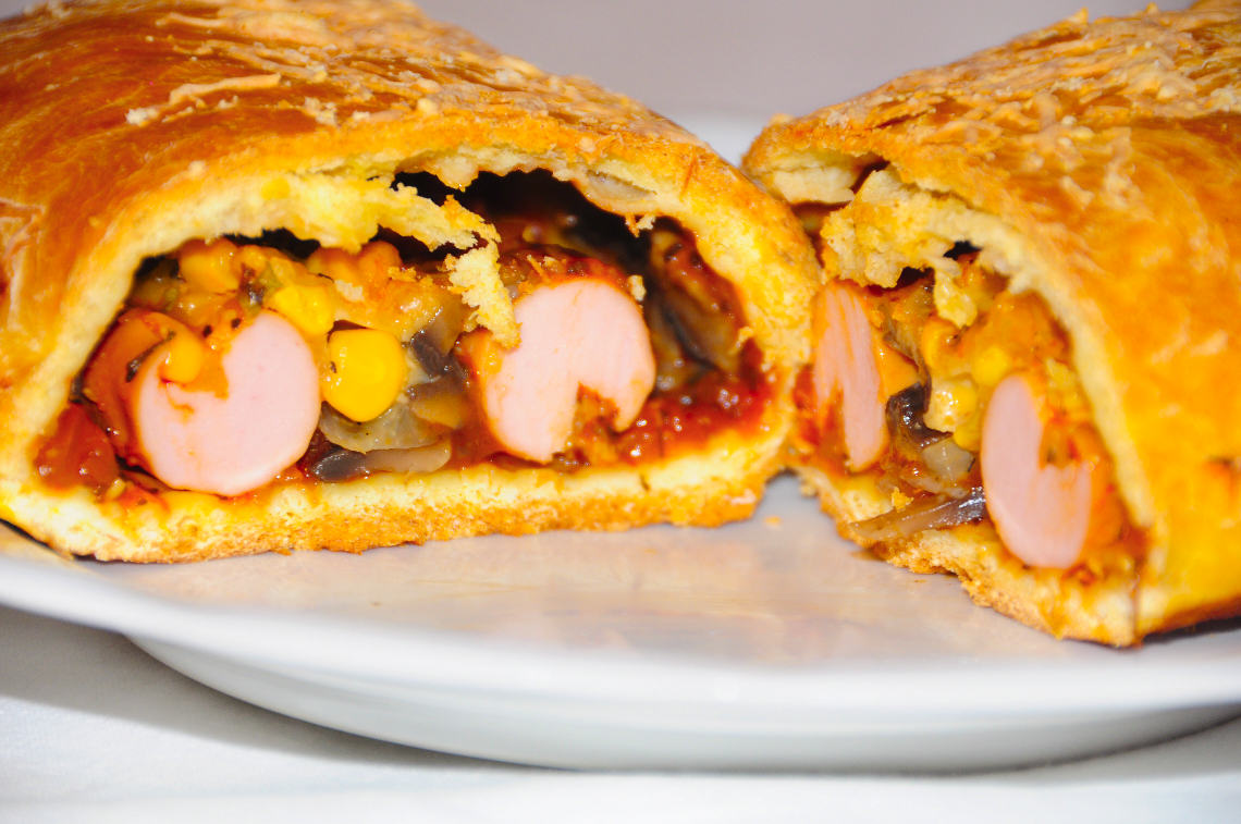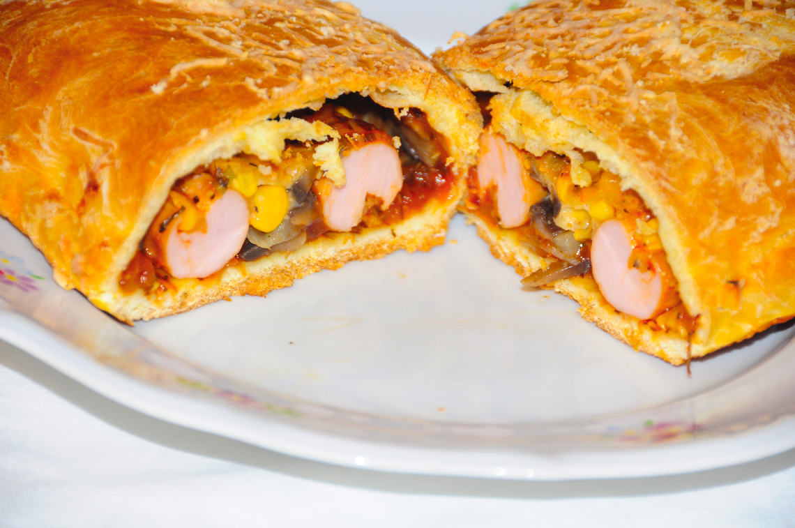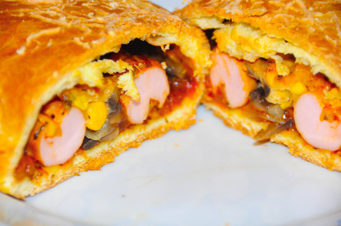 Pomiędzy parówki włożyłam pieczarki i dodałam kukurydzę.