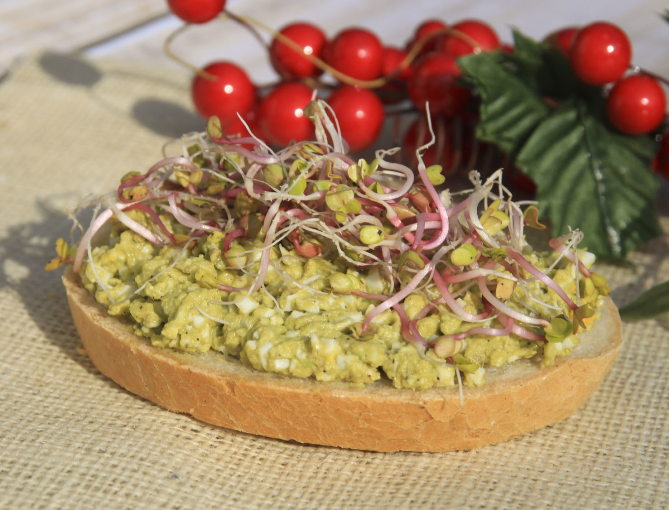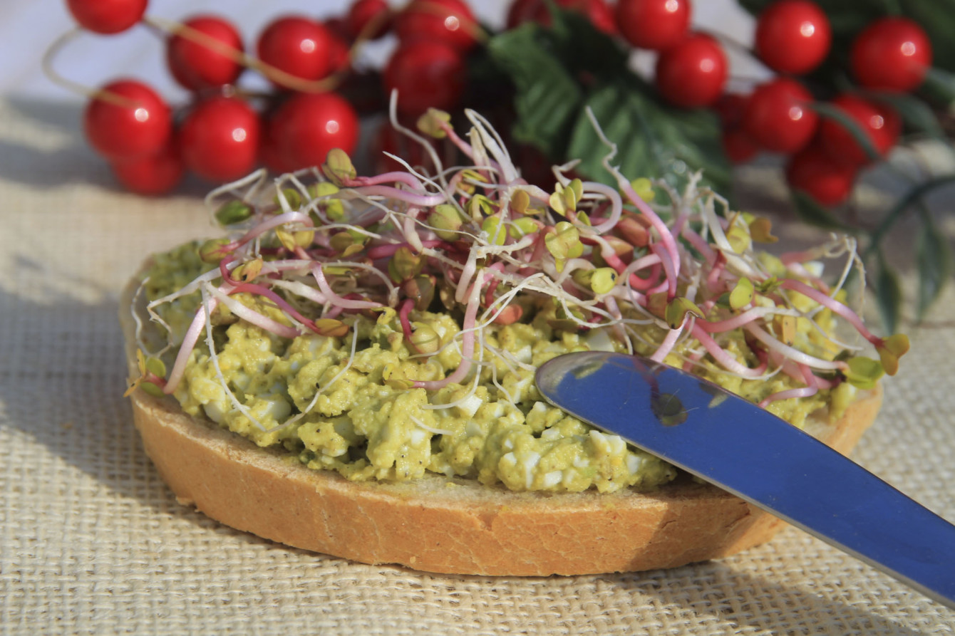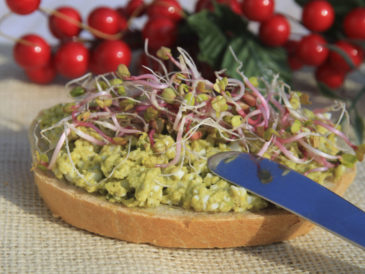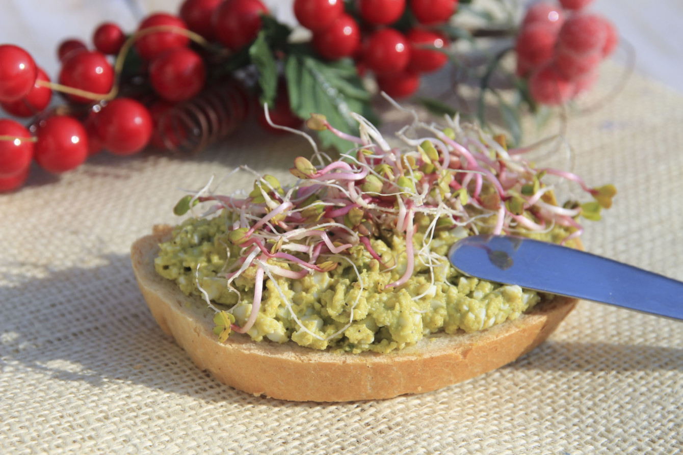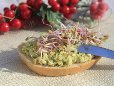 Przygotowaną pastą smarujemy np. pieczywo, a na jego wierzch dodajemy kiełki.