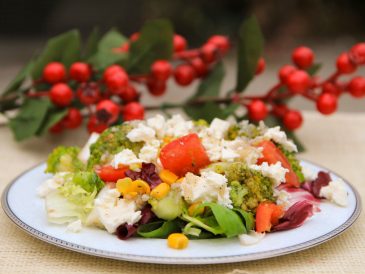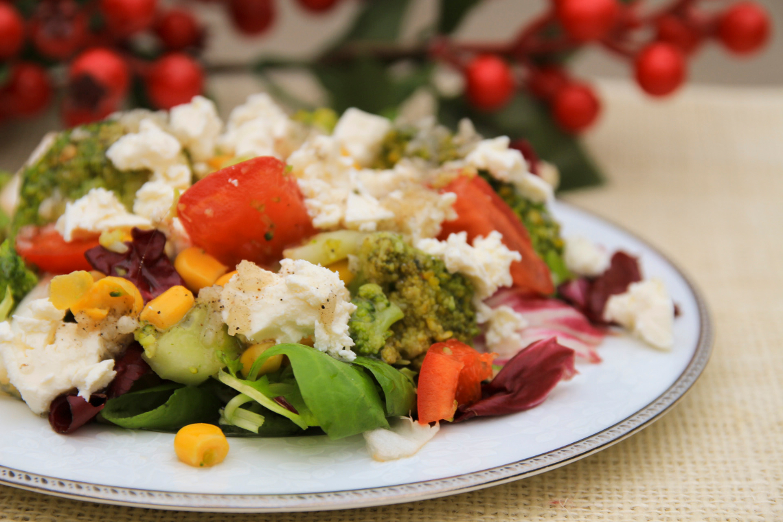 W misce łączymy ze sobą brokuł, paprykę, pomidory, ogórek i kukurydzę.