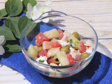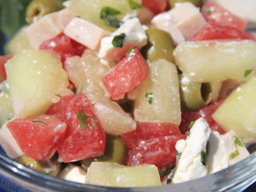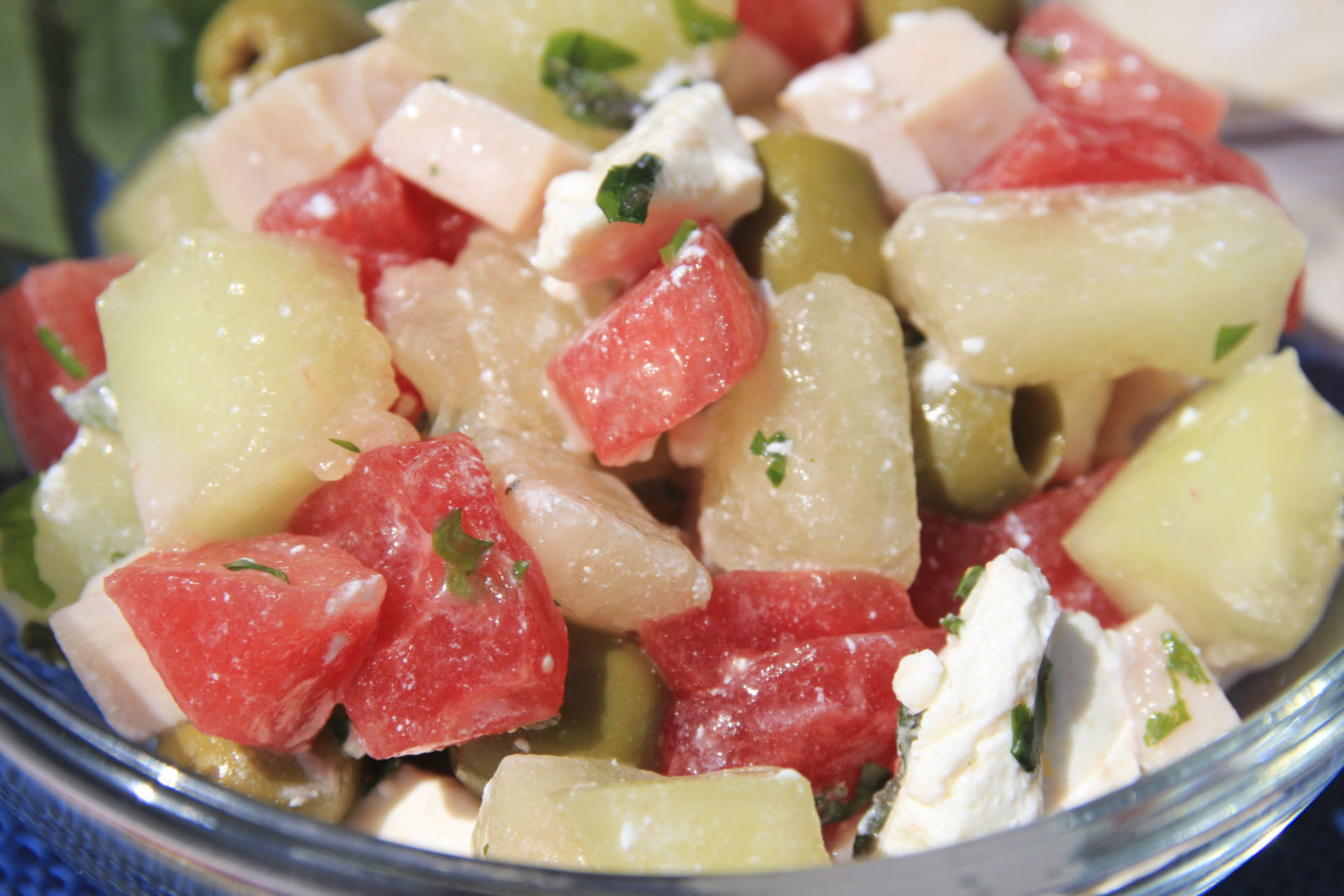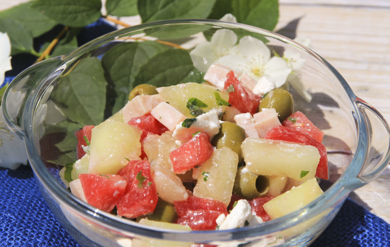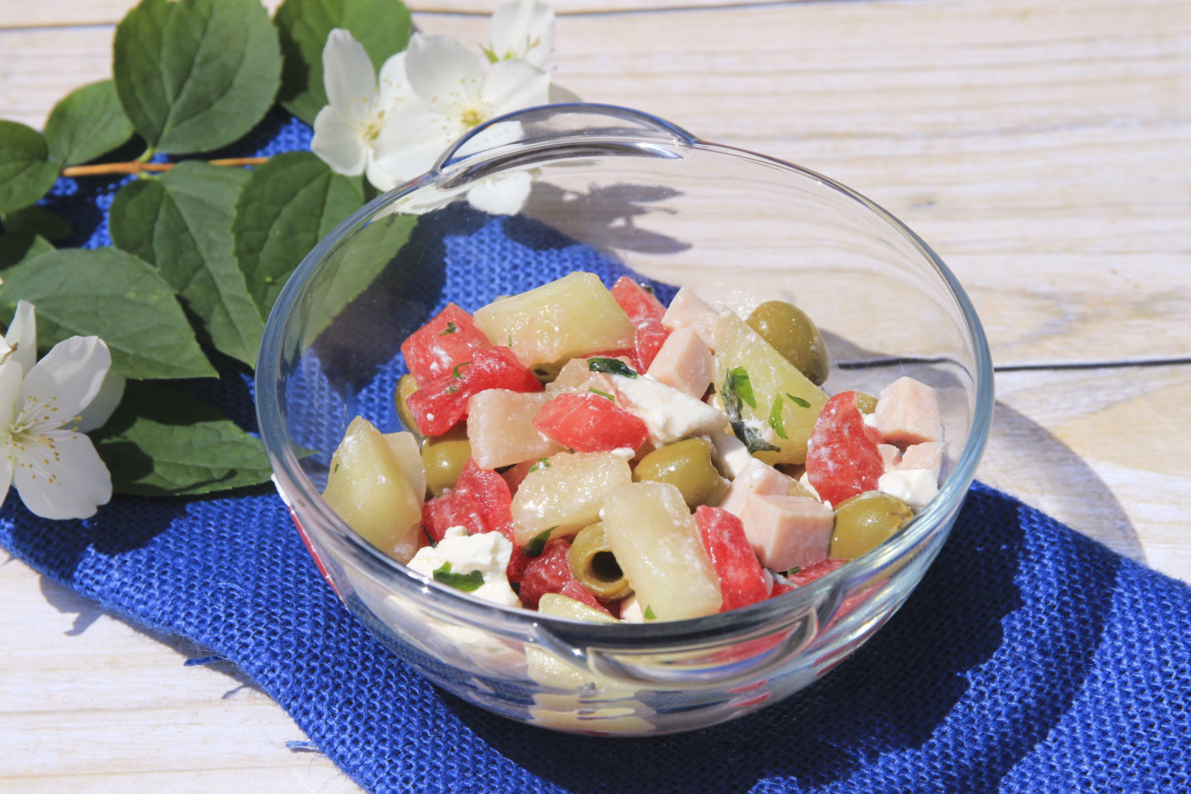 Sałatka z melona, arbuza, oliwek i szynki