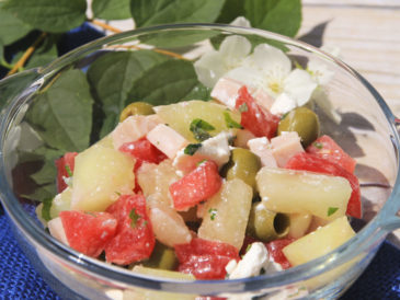 Sałatka z melona, arbuza, oliwek i szynki to smaczne i lekkie połączenie które urozmaici Wam nie tylko dzień.
