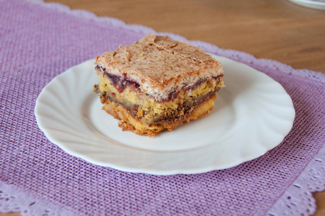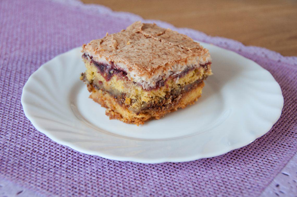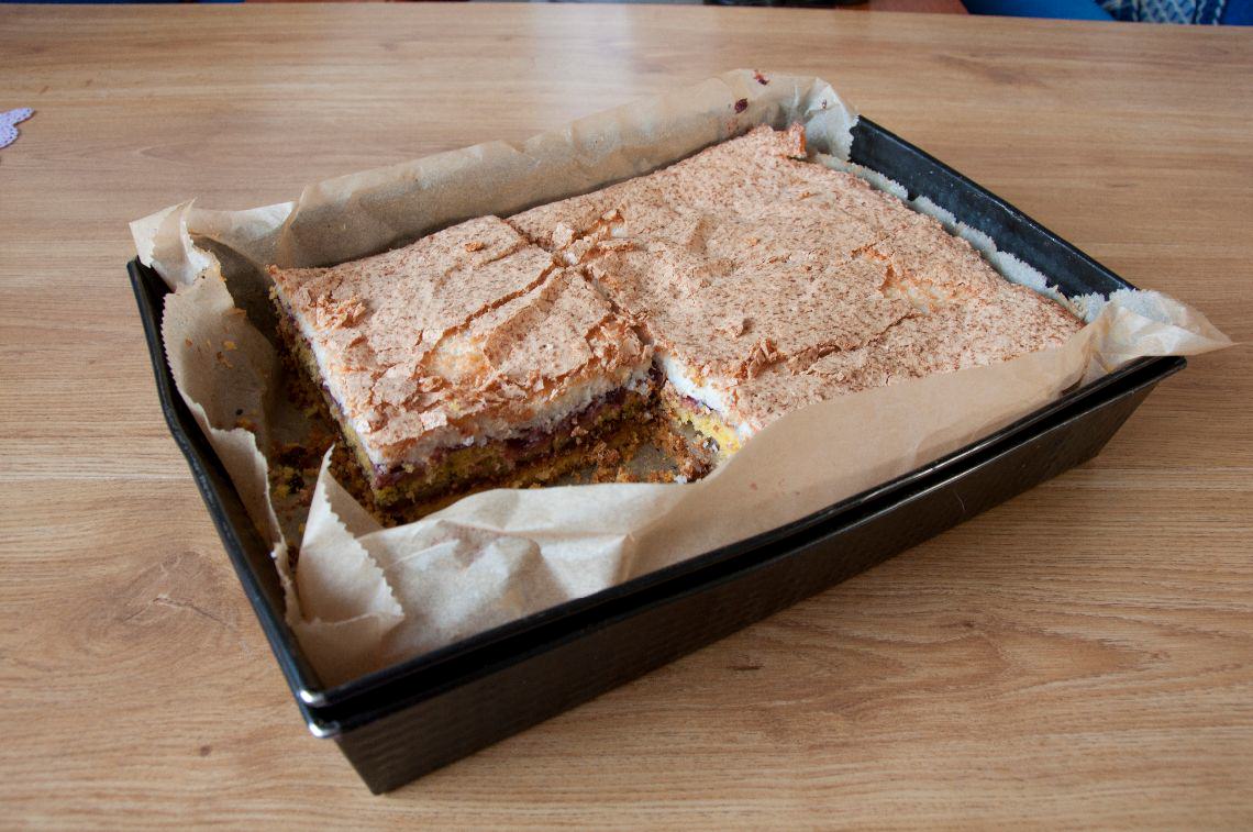 Ciasto smarujemy dżemem. Ubijamy pianę z białek, dodajemy cukier i dalej ubijamy.