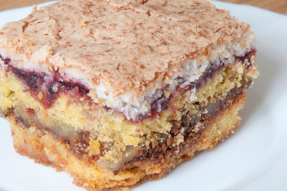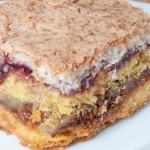 Na koniec dodajemy wiórki kokosowe. Na ciasto z dżemem wykładamy pianę.