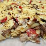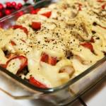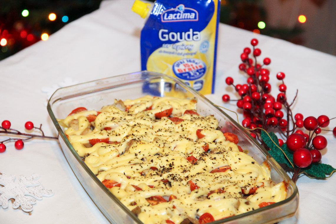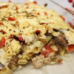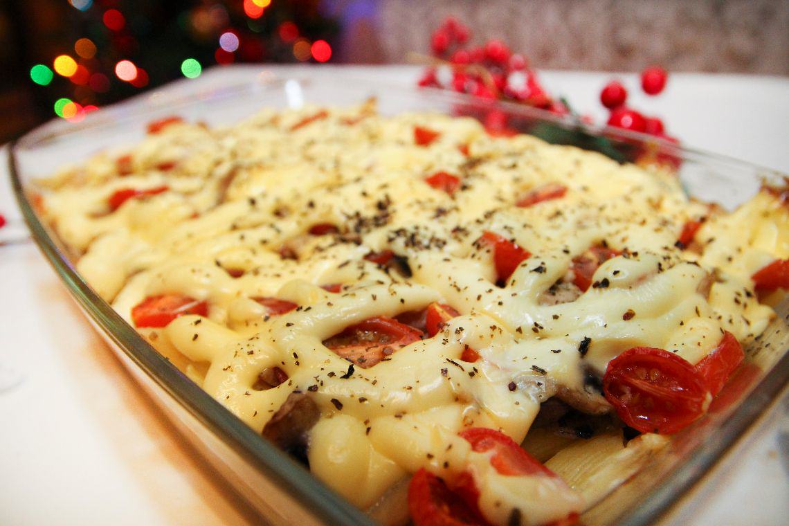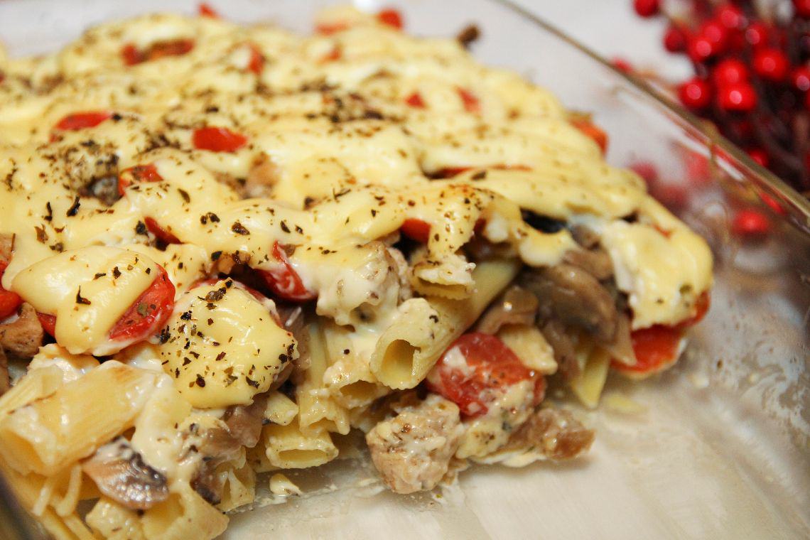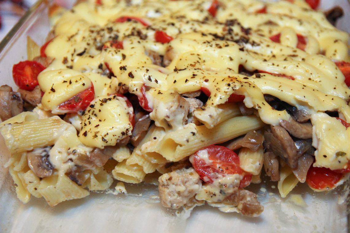 Zapiekanka makaronowa z kurczakiem, pieczarkami i pomidorkami